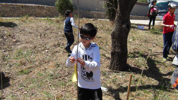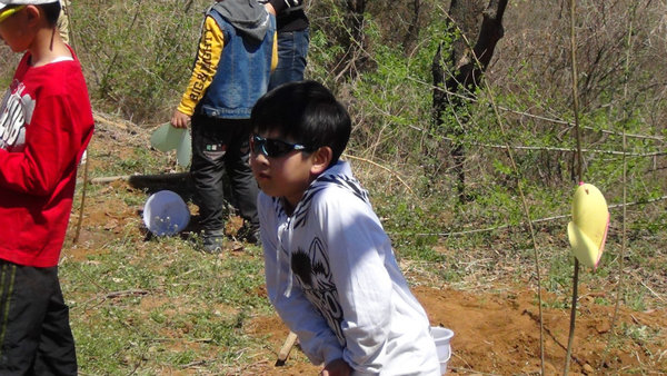 大家休息了一会儿,就开始去植树了!我们每人领一棵树苗,家长们拿着树苗和铁锹,孩子们提着水桶。