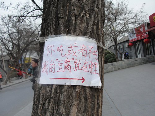 香山北门下面一家炸臭豆腐的小吃店门口的广告,贴在树上了。