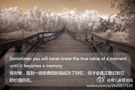 Sometimes you will never know the true value of a moment until it becomes a memory. 有时候,直到一些珍贵的时刻成为了回忆,你才会真正意识到它的价值所在。