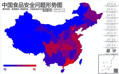 中国食品安全问题形式图。蓝色表示乐观,红色越深表示问题越大。