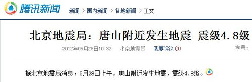 北京地震局:唐山附近发生地震 震级4.8级。我没有感觉到啊。